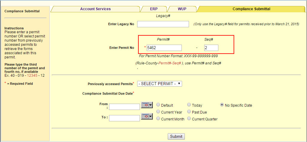 b. Enter the Permit Number and Sequence Number and click Submit.