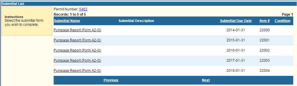 Select the submittal form you wish to complete by clicking on the link under the Submittal Name column.